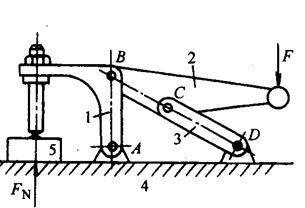 除此之外,工程上也常利用机构的死点位置,来实现一定的工作要求。如图2-64所示的铣床快动夹具,当工件被夹紧后,无论反力FN有多大,因夹具BCD成一直线,机构(夹具)处于死点位置,不会使夹具自动松脱,从而保证了夹紧工件的牢固性,提高了工作的可靠性。