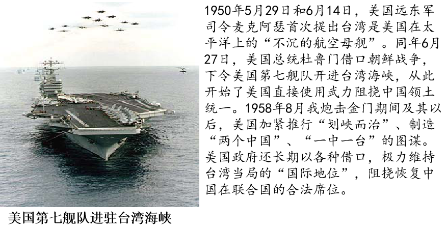 解放战争后,国民党集团败退台湾,他们在当时美国政府的支持下,造成了台湾海峡两岸隔绝的状态。正当中国人民解放军准备着手解放台湾时,朝鲜战争爆发,美国军队进入台湾和台湾海峡地区,阻挠中国人民解放军解放台湾,从政治上、经济上、军事上扶持国民党政权,形成台湾与大陆对峙的局面,台湾问题由此产生。