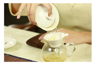 (6)出汤:即将盖碗中冲泡的普洱茶汤倒入公道杯中,出汤前要用碗盖刮去浮沫。