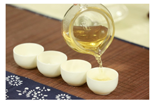 (7)分茶:将公道壶中的茶汤依次倒入品茗杯中,以七成满为宜。