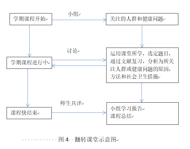 在学习的方法上,采用了贯穿整个学习内容的翻转课堂方式,目的是让学生用已经学习过的理论和方法,对社会卫生问题和社会卫生措施进行综合分析,加强学生对理念和方法的理解和认知。具体方法如图4所示。