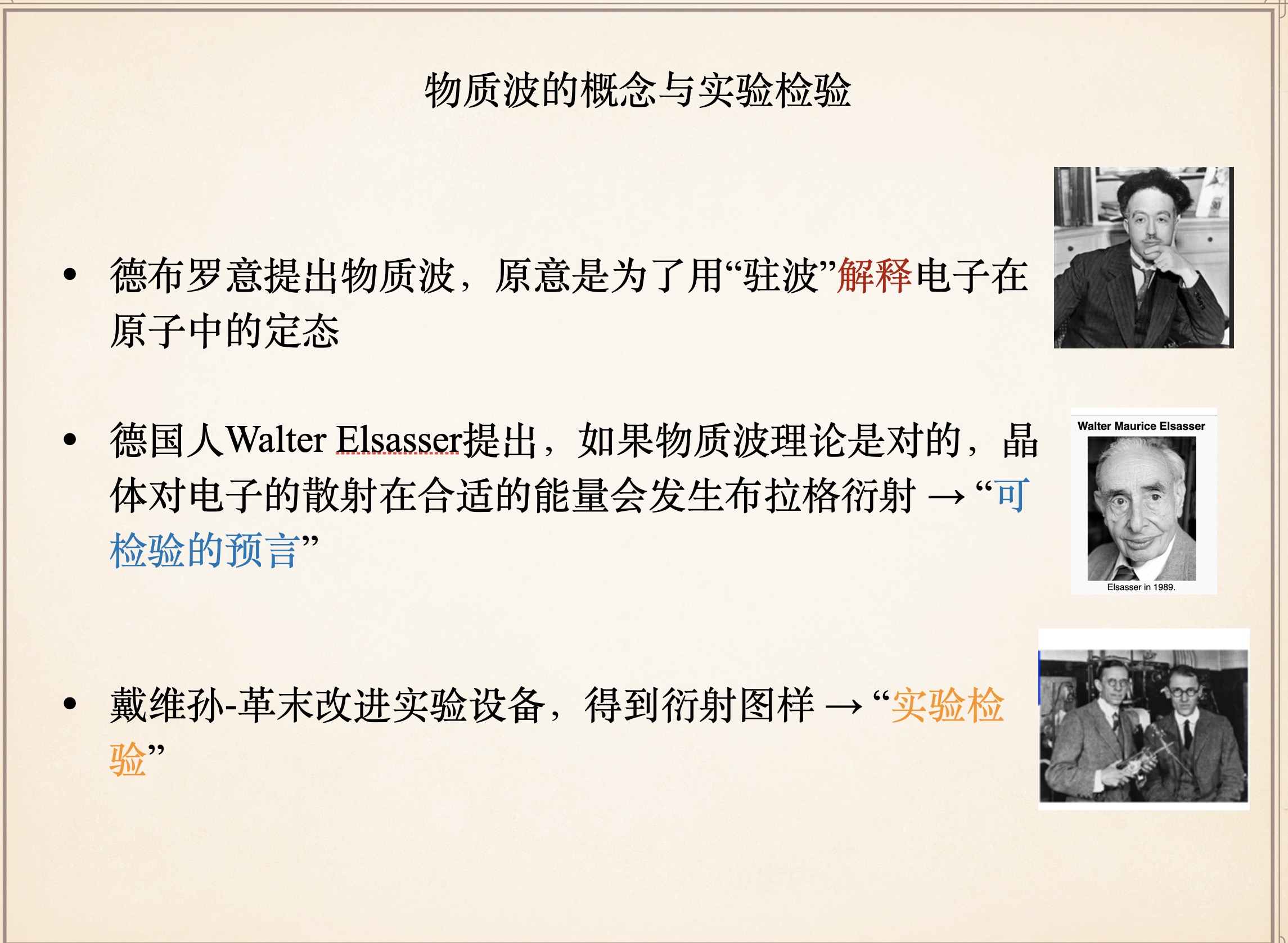 当时,在美国贝尔实验室工作的Davisson与Germer两人恰好在做类似的电子散射实验,用的是镍晶体,但是目的却不一样,本来是为了观察次级电子发射。不过,在听到Born关于Elsasser想法的报告以后,Davisson意识到他们也可以作同样的实验,而且可以做的更好。原因是依托贝尔实验室,Davisson实验的技术条件更好,能实现更高的真空以及制作更好的探测器。两人加紧工作,很快就测到了布拉格衍射中标志性的在一定角度出现的衍射极大,找到了电子物质波的第一个直接证据。