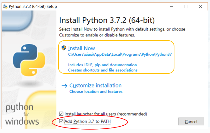 (3)以Windows为例,安装时,以下页面,请手动选中“Add Python 3.7 to PATH"选项。