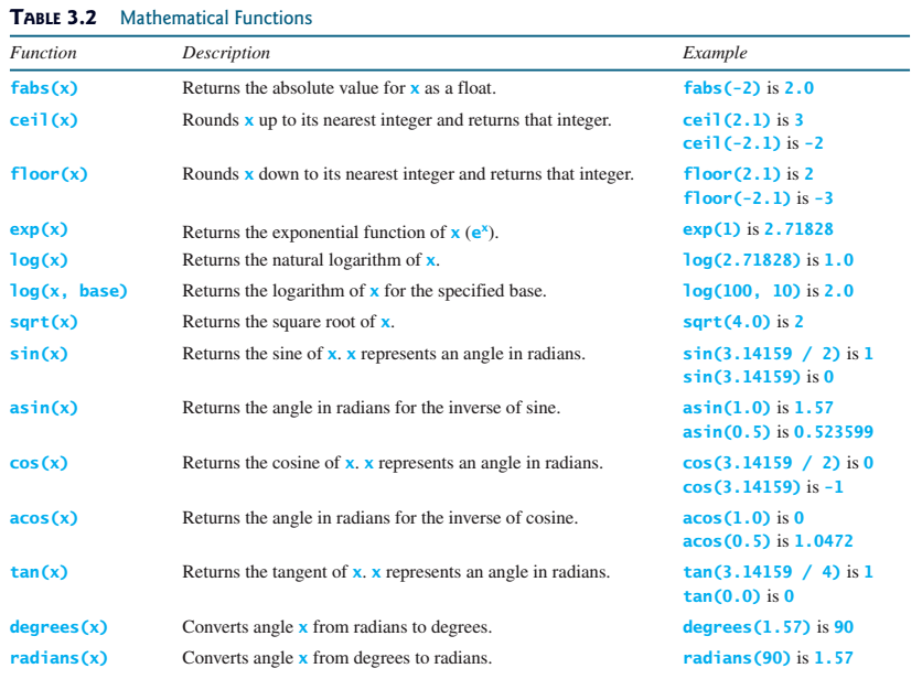 math提供了两个常数,pi 和e. 可通过 math.pi 和math.e 使用它们。例如,求圆的面积area = math.pi * r*r