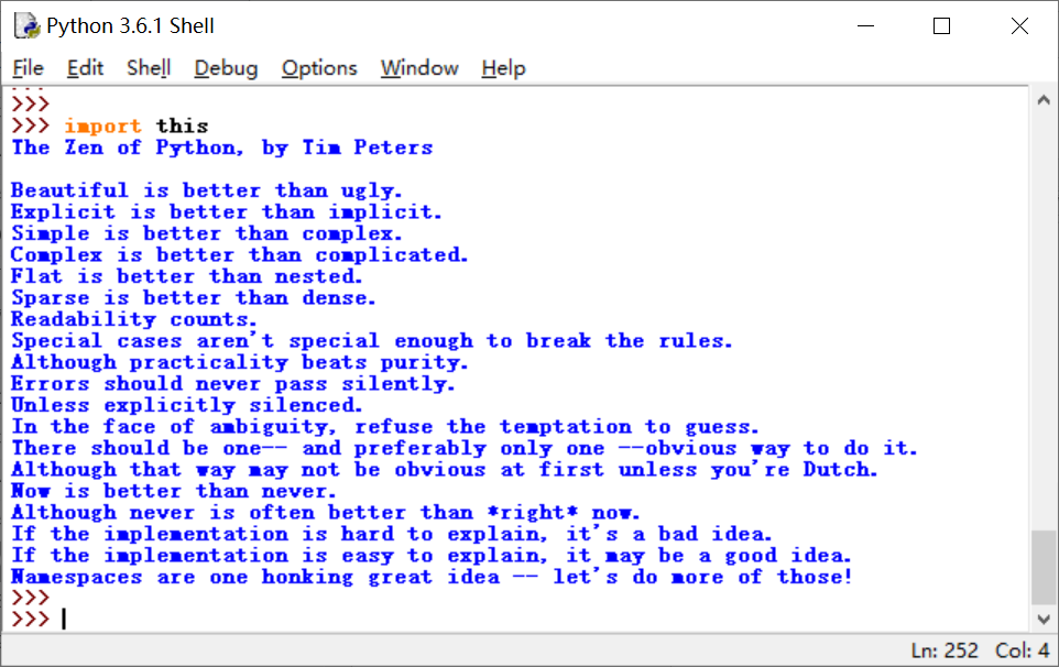 到目前为止,我们已经编写了不少的代码。那么怎么样的代码是“好”的,“漂亮”的呢?Python编译器以函数库的形式内置了一个有趣的文件,称为“Python之禅”(The Zen of Python)。输入:
