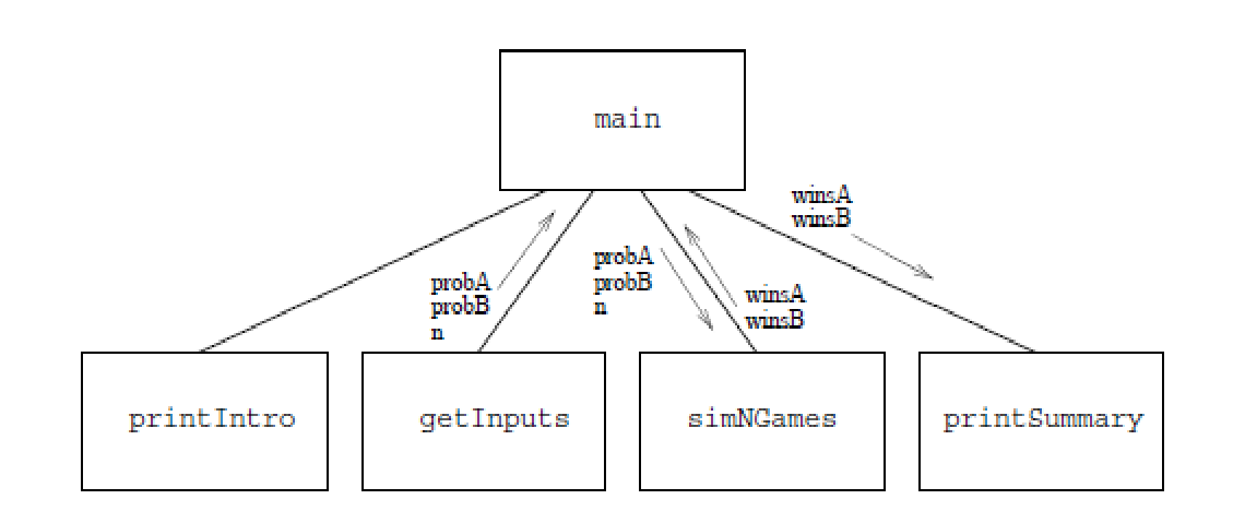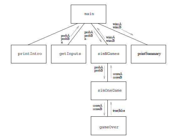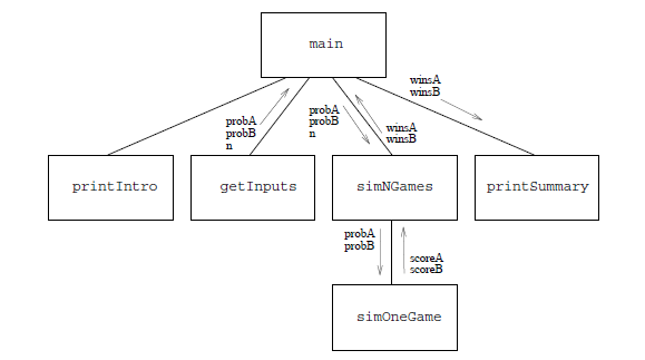 simNGames()函数是整个程序的核心,模拟n场比赛,并记录球员的赢的次数。重复n次,每次记录赢的情况,用计数器变量完成。代码: