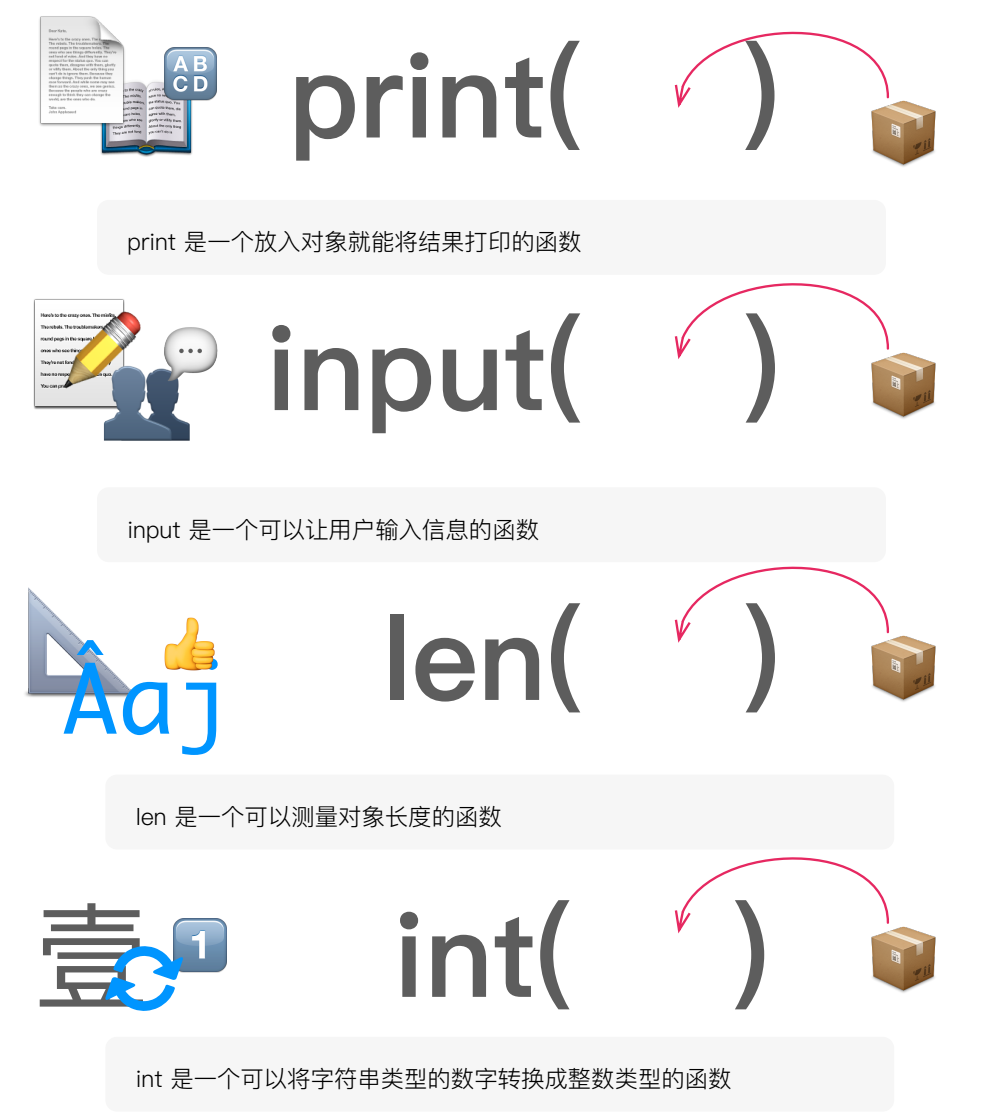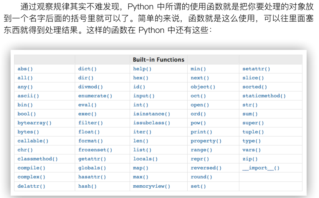 这些函数被统称为内置(内建)函数(built-in function)。内建的意思是这些函数可以直接使用它们,是“自带”的。不用担心这些术语,其实都只是很简单的概念,只是为在一专业领域内表达准确和高效往往使用专业术语。