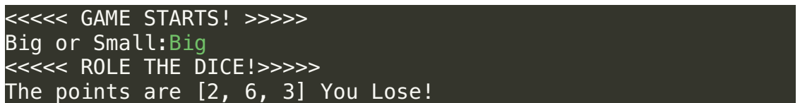 游戏开始,首先玩家选择 Big or Small (押大小),选择完成后开始摇三个骰子计算总值, 11到18之间(包含)为“大”,3到10之间为“小”。然后告诉玩家猜对或是猜错的结果。看起来就像这样:
