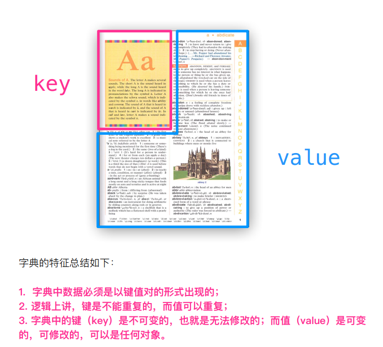 编程世界里有很多概念其实都是基于现实生活的原型,字典这种数据结构的特征也正如现实生活中的字典一样,使用名称-内容进行数据的构建,在Python中分别对应着键(key) - 值(value),习惯上称之为键值对。