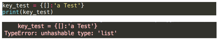 我们再试着将一个可变(mutable)的元素作为key来构建字典,比如列表: