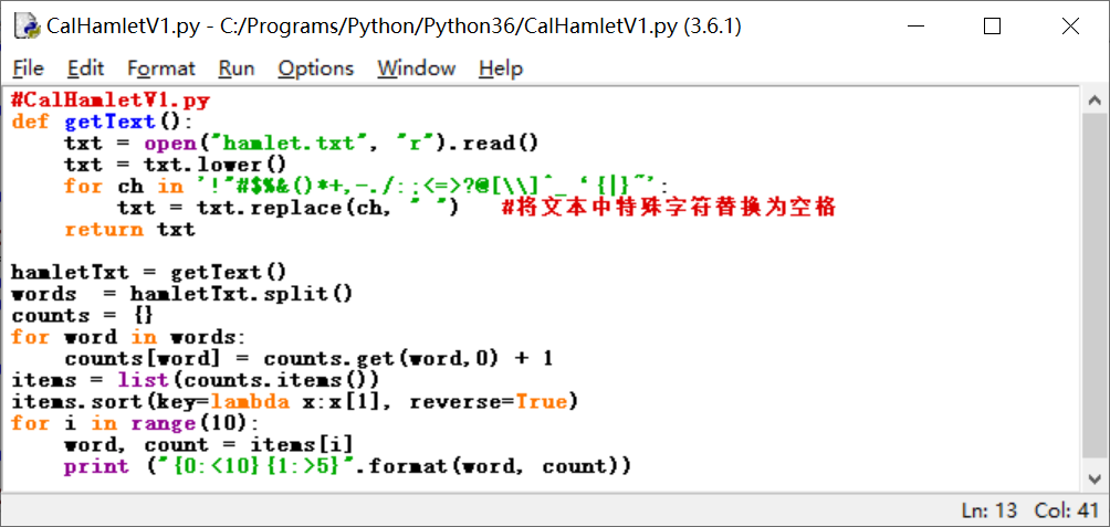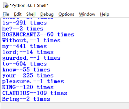 英文文本是以空格或标点符号分隔出单词。以Hamlet.txt为输入,考虑到同一单词存在大小写问题,因些首先通过字符串函数lower()将全文字母转为小写; 为方便分隔,把全文的分隔符全部转为空格,这可以使用字符串函数replace()完成。