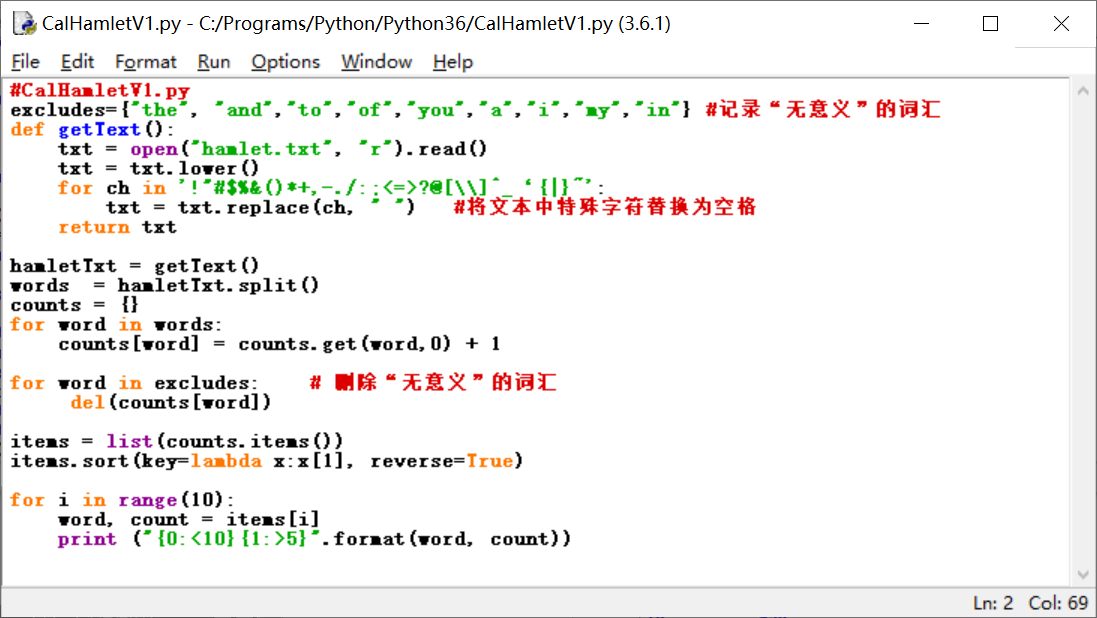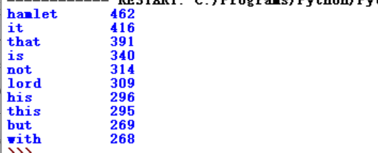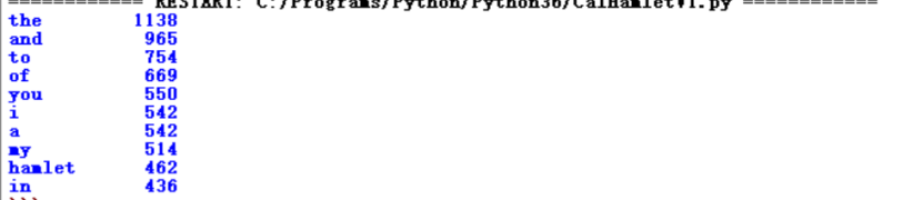 从结果可以看到,高频词大多是一些冠词、代词、连接词等,并不代表文章的意义。为进一步将有“意义”的词提取出来,就需要将这些“无意义”的词排除掉。可以用一个变量excludes存储这些“无意义”的词,excludes={"the", "and","to","of","you","a","i","my","in"}。代码如下:
