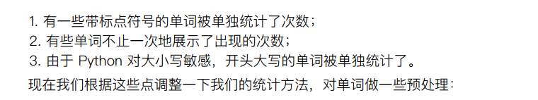 接着,将调整过的全文(全小写,单词用空格分隔)针对 每个单词进行计数。例如,若一个单词放在word变量中,使用字典类型变量counts在存放单词的次数。当遇到一个单词,如果是新的单词,则使用counts[word]=1; 如果这个单词不是第一次遇到,则使用counts[word]+=1。那么如何判断一个单词是否是新的呢?可以看这个单词是否在counts字典中,使用