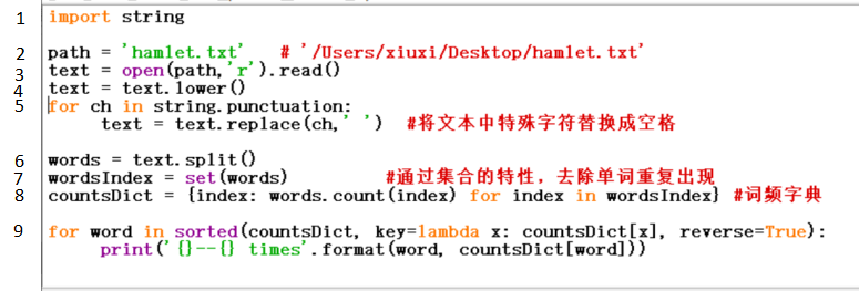 第8行: 创建一个以单词为键(key)出现频率为值(value)的字典;
