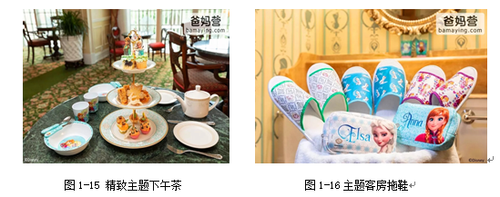 房间内更有适合孩子的小小玩乐天地,大型雪宝的毛绒公仔、冰雪奇缘主题的绘本书籍,都让小朋友们爱不释手。爸爸妈妈们则可以享受套房内的精致主题下午茶(图1-15),点心颜值、口味同时在线,绝对是视觉、味觉的双重享受!旁边还有为孩子们特地准备的主题餐具。此外,入住主题套房,还能获得限定的《冰雪奇缘》主题洗漱用品一套,一家三口不同款式的拖鞋(图1-16),迪士尼商店里都买不到。