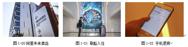 酒店最大的特点是智能化服务:人脸成了房卡的代替品(图1-21)、看不到门口帮客人打开车门的服务生,甚至也没有前台,只有白色的灯光、曲线与大屏幕营造的先锋与科技感。整个酒店还配备有智能机器人,可以完成自动取餐、配送等服务,在房间里,配备有“天猫精灵“可以实现语言操控房间设施。我们在传统酒店退房时,前台会派卫生阿姨前去查房,但在未来酒店,客人只需在手机上退房(图1-22),系统就会弹出客人的所有消费金额。点击确认,随时离店。
