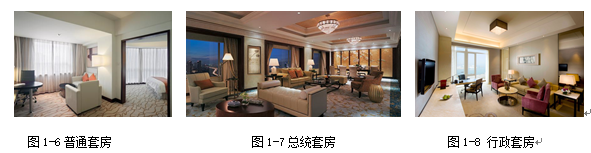 6.行政套房(Executive Suite)(图1-8)- 行政套房集中于酒店行政楼层,有独立的接待处为客人办理入住及离店手续,配有专用商务中心、行政酒廊等,为客人提供早餐和下午茶服务。