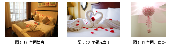随着消费观念的转变,现代年轻人都选择在酒店办婚宴,因此,酒店在订婚宴的同时也会为新人设计婚房(图1-17)。有些酒店会采用中国元素(图1-18),有些酒店会采用中西结合(图1-19)的方式为新人布置婚房,营造幸福的氛围,表达对新人良好的祝福。
