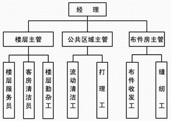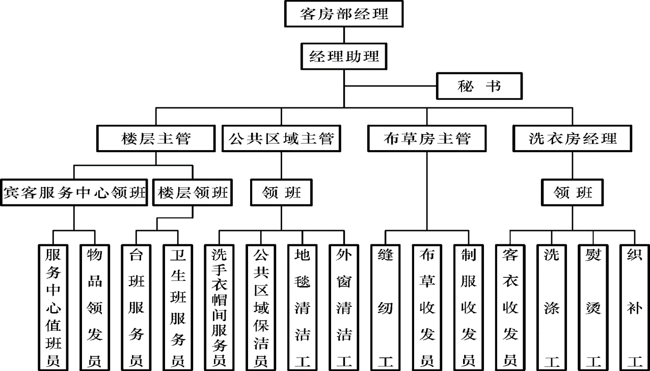 酒店客房部组织结构的设置要考虑的因素包括饭店性质、档次、客源结构和层次以及员工素质等等,各酒店应根据酒店实际运营需要设置相应的组织机构,大中型酒店(大于300间房,图1-10)的客房部岗位全、分工细,员工人数较多;小型饭店(小于300间房,图1-11)的客房部岗位则应扁平化,一人多能,员工人数较少。客房部组织机构没有统一的模式,随着酒店发展变化而及时调整。