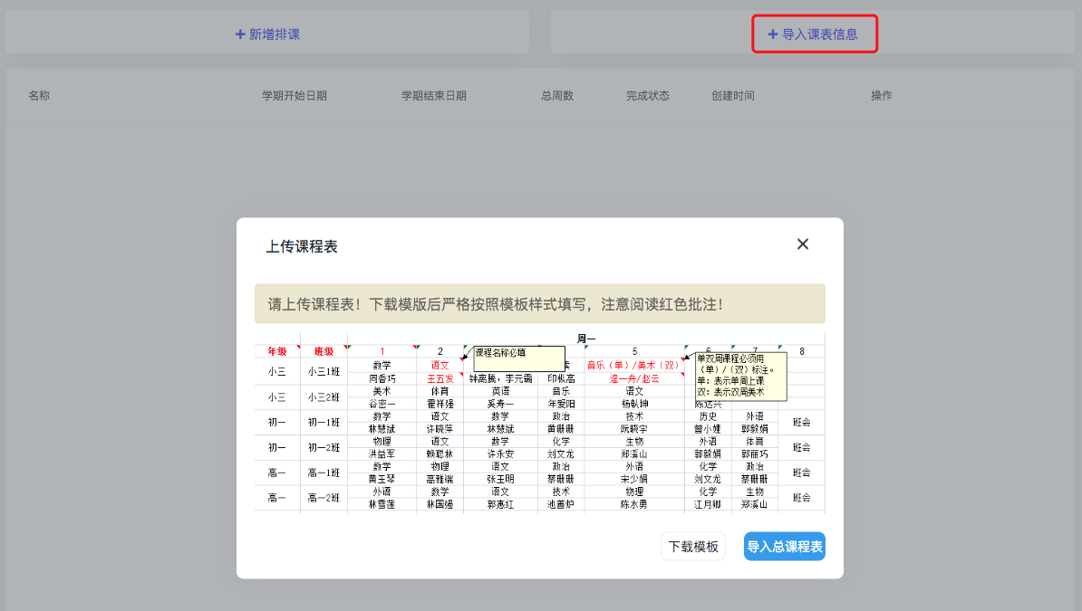 2.直接导入课表信息,导入课表信息-下载模板-填好后上传
