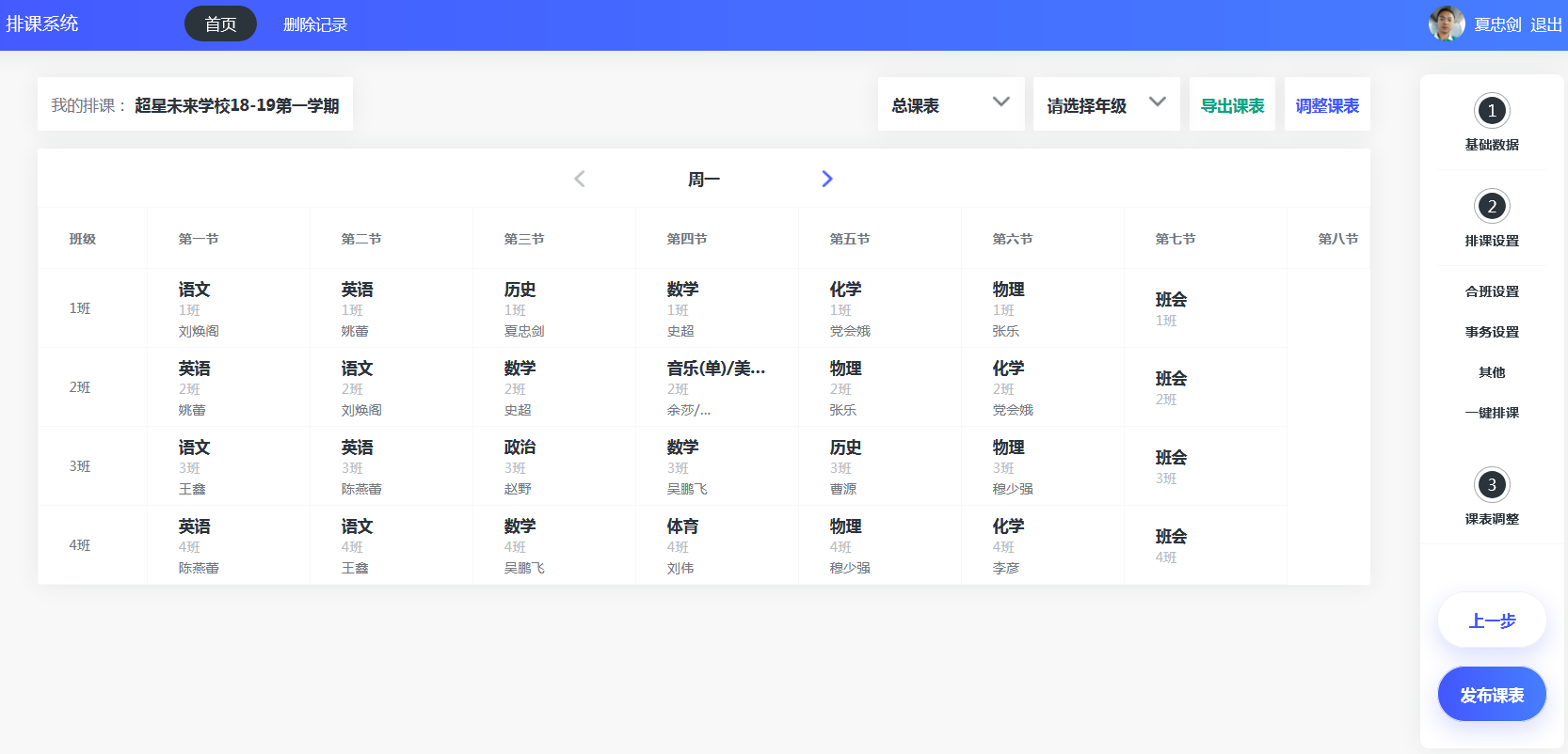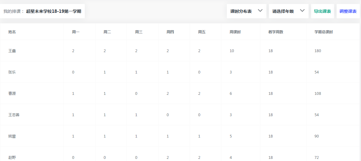 完成排课后,可通过查看课表来整体预览课表。预览维度包含:总课表、班级课表、教师课表、总任课表、课时分布、学科课表。