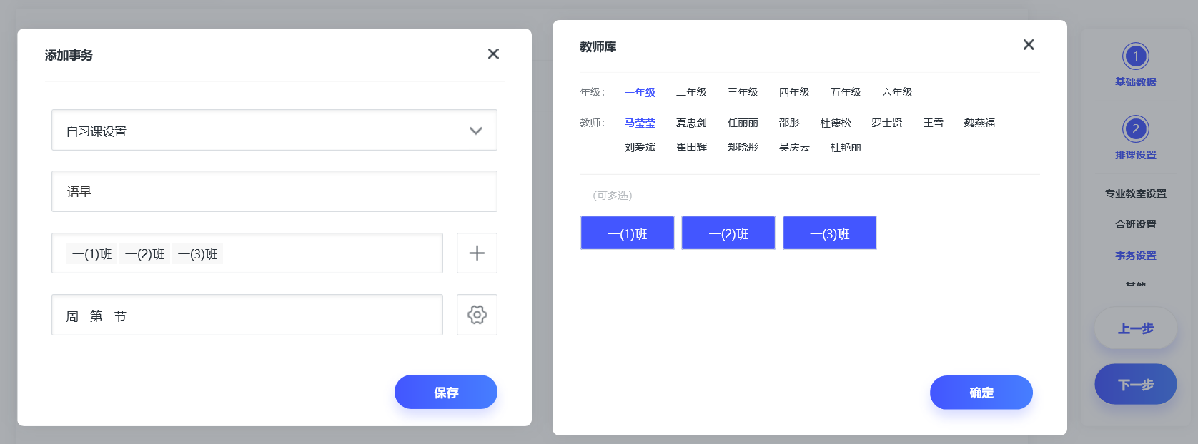 A:可以使用“事务设置-自习课设置”。早晚自习课可以设置一名教室同一时间带多个班,以维持纪律和解答问题为主。