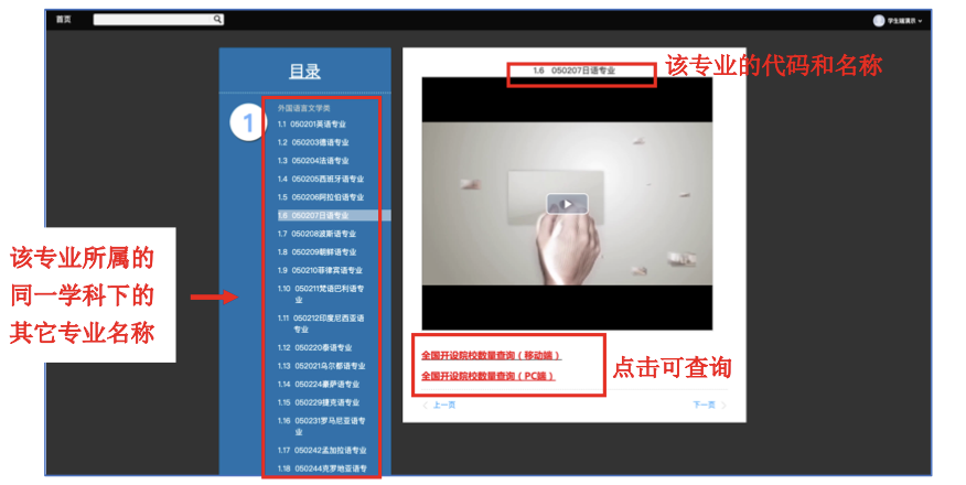 学生不仅能够观看的该专业视频解读,还能看到该专业所属的一级学科下其它专业的 视频解读,以及查看该专业全国开设院校数量的情况。该模块与【数据查询】中的【专业大 全】可双向查看。