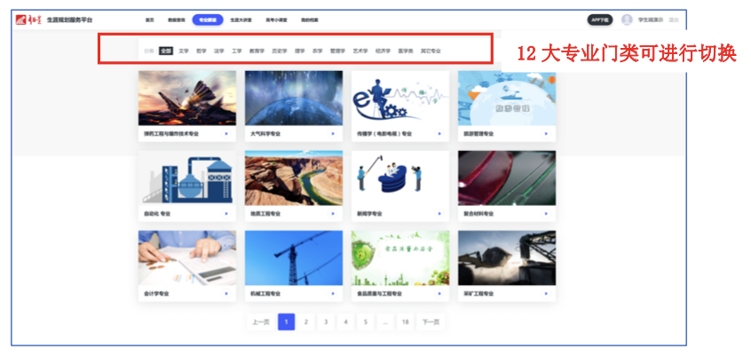 该模块以本科 12 个门类的 92 个学科专业为一级目录标准为学生提供相应专业的视频 解读,一些全国唯一开设的专业院校,像壮医学、轴承专业等,都有请相关学校老师进行解 读。能够满足不同区域、因地制宜的、多元化的需求。课程主包括专业介绍、必备知识、就 业前景、发展趋势、知名院校等模块。