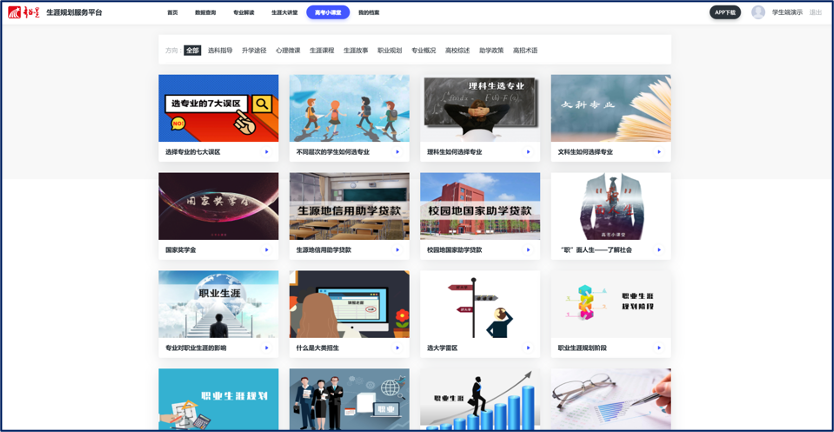 该模块将生涯方面和高考相关的大量信息进行可视化、主题化,并归纳成 10 大主题, 分别为:选科指导、升学途径、心理微课、生涯课程、生涯故事、职业规划、专业概况、高 校综述、助学政策、高招术语。每个主题采取微视频形式。