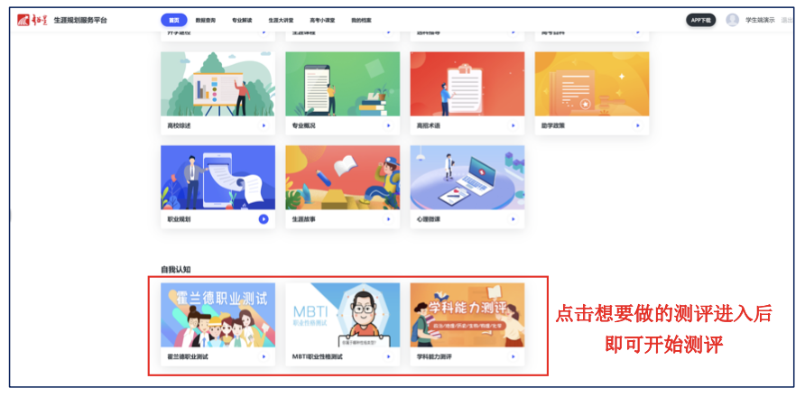 帮助学生从生涯的各个维度全方位了解自我,认识自己的学科优势与不足。目前主要包 括霍兰德职业兴趣测评、MBTI 职业性格测评和学科能力测评。