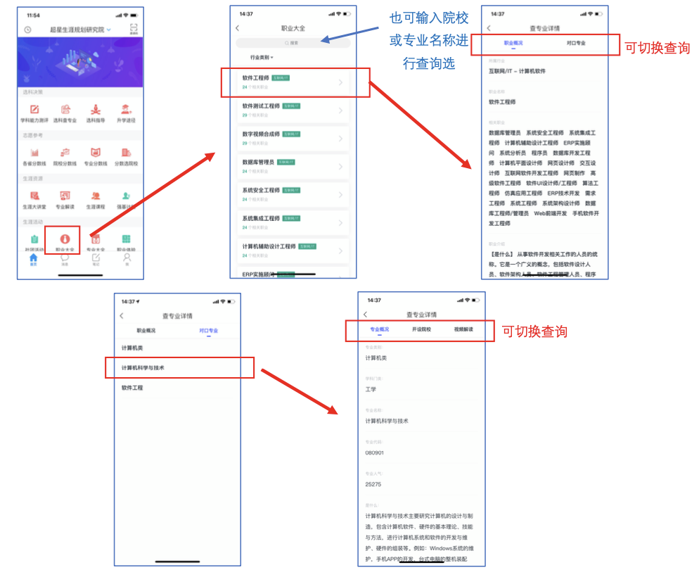 查看职业的相关信息,包括所属行业、相关职业、对口专业、专业详情。