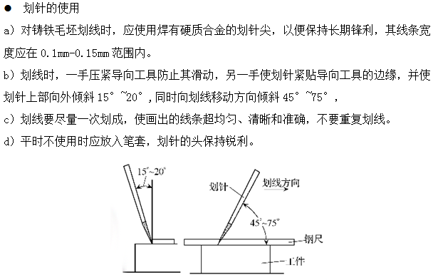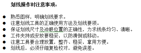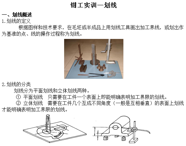 划线-作为零件加工的头道工序,对零件的加工质量有着密切的关系。钳工在划线时,首先应熟悉图样,合理使用划线工具,按照划线步骤在待加工工件上划出零件的加工界限,作为零件安装(定位)、加工的依据。