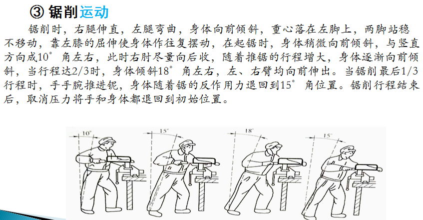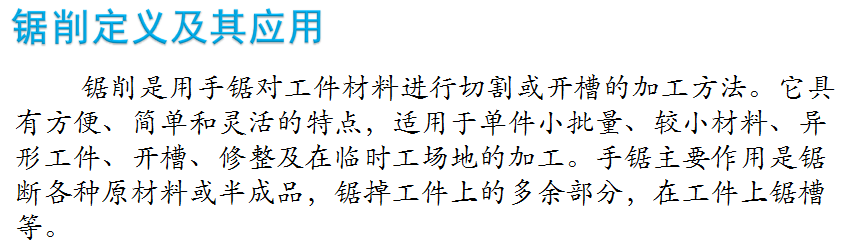锯削是用手锯对工件材料进行切割或开槽的加工方法,是钳工一项基本操作技能。接下来我们学习一下。