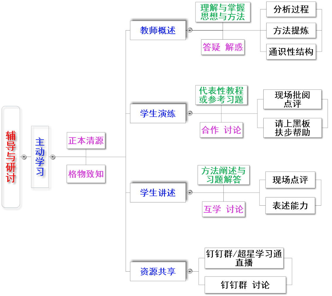 (2)第二阶段,固定时间的教师讲述与讨论。基于第一阶段的学习,本阶段的教师阐述注重知识的方法化、思想化、通识化,可以基于实体板书或者电子板书进行讲述;本阶段也将组织同学们进行相关内容的阐述,师生一起进行点评与讨论。通过本阶段的内容澄清与答疑解惑,期待对知识的掌握程度能提升至70-80%。