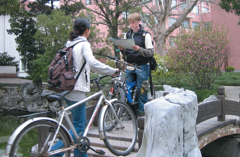 Shelley and Michael happen to run into each other on a bridge in a historic town. Both of them express surprise at unexpectedly meeting up with each other. At that moment, they are exploring the historic town on their bicycles. Actually, Shelley and Michael have not seen each other for a long time. Michael has been keeping busy learning Chinese, a foreign language for him. Both of them are very much interested in Chinese culture, and, of course, Chinese food.