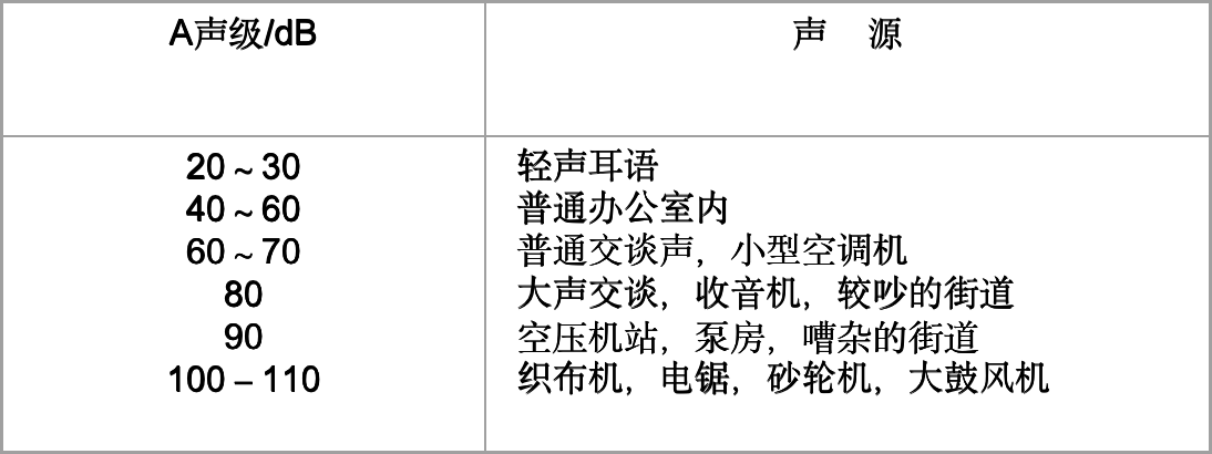原来规定70dB以下用A声级计,70~90 dB用B声级计,90 dB以上用C声级计。后来研究表明,无论声强多大,A声级都能较好地反映人耳的响应特征,所以,如无特殊说明,基本都用A声级表示噪声评价指标。表6-4 为几种常见声源的A 声级。