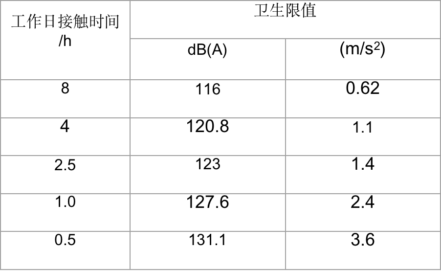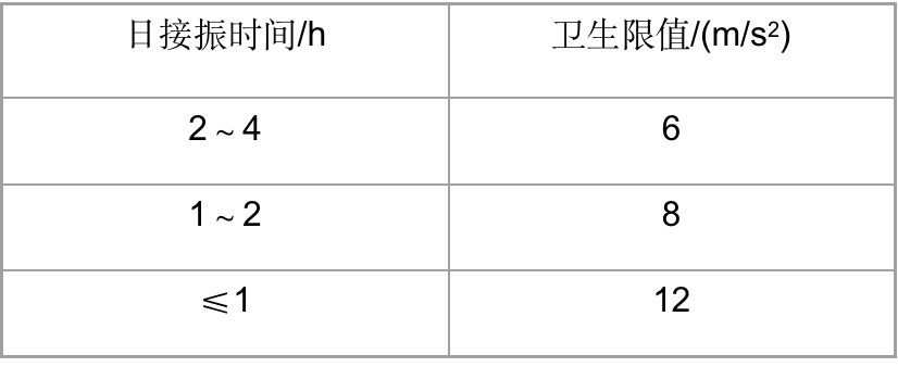 GBZl--2002《工业企业设计卫生标准》中对工作场所的振动强度规定如下:局部振动作业,其接振强度4小时等能量频率计权振动加速度不得超过5 m/s2,接振时间少于4小时可按表6-17适当放宽。