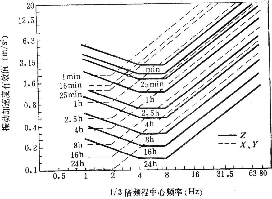 该标准根据加速度有效值(0.1~20m/s2)、振动频率(1/3倍频程的中心频率,1~80 Hz)、振动方向(Z轴向,X、Y轴向)、接触振动持续时间(1分钟到24小时)这四个振动参数制定了全身振动评价的界限曲线,并依据参数之间的关系来评价全身振动对人体的影响。