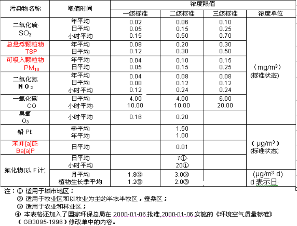 空气环境质量分为三级:一类区执行一级标准,二类区执行二级标准,三类区执行三级标准。共限定了以下几种污染物的浓度值:SO2、TSP、PM10、NO2、CO、O3、、Pb、B[a]P、F。