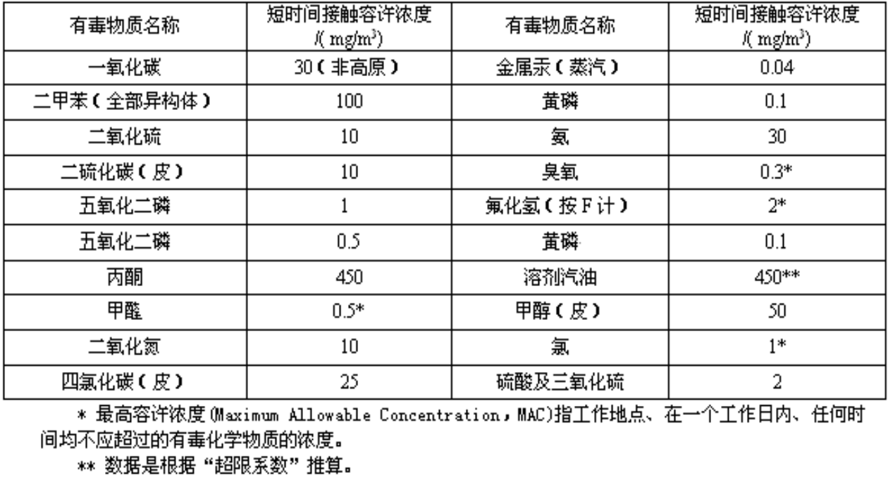 工作场所空气中部分有毒物质短时间接触容许浓度(见表7-2)包括车间含有两种以上有害物质时的浓度标准评价