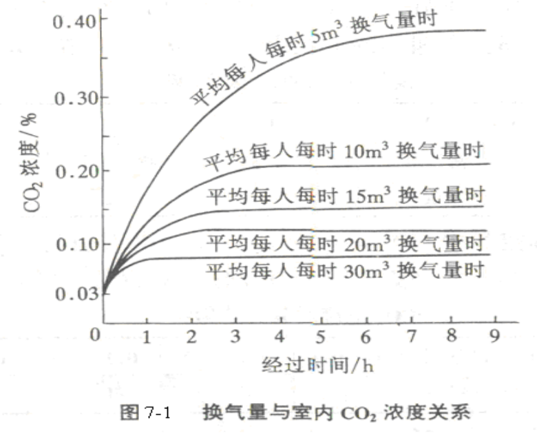 下图表示每人10m3的空气体积,平均每人每小时呼出18L(RMR为0.4)CO2的情况下的换气量和室内CO2浓度的关系。