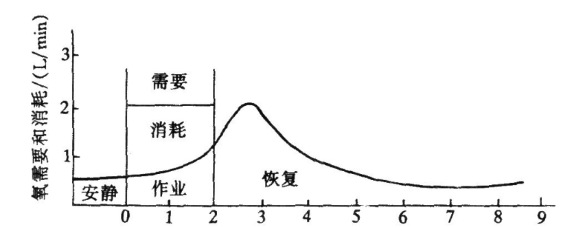 静态作业的特征是能量消耗水平不高,但容易发生疲劳。即使劳动强度很大,氧需也达不到氧上限,通常每分钟不超过1L。但在作业停止后数分钟内,氧耗不像动态作业那样迅速降低,而是先升高,然后再逐渐降低到安静水平。具体如图8-8所示。