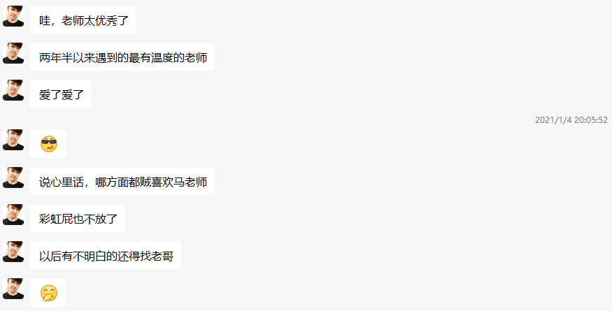 在教师完成了“生命以负熵为生,生活以自律为美”课程思政教学案例教学之后,学生通过课程教学群反馈“大学两年半以来遇到的最有温度的老师”,体现了同学们对课程思政教学理念良好的接受度,也从侧面反应了课堂思政“润物细无声”的教学效果。