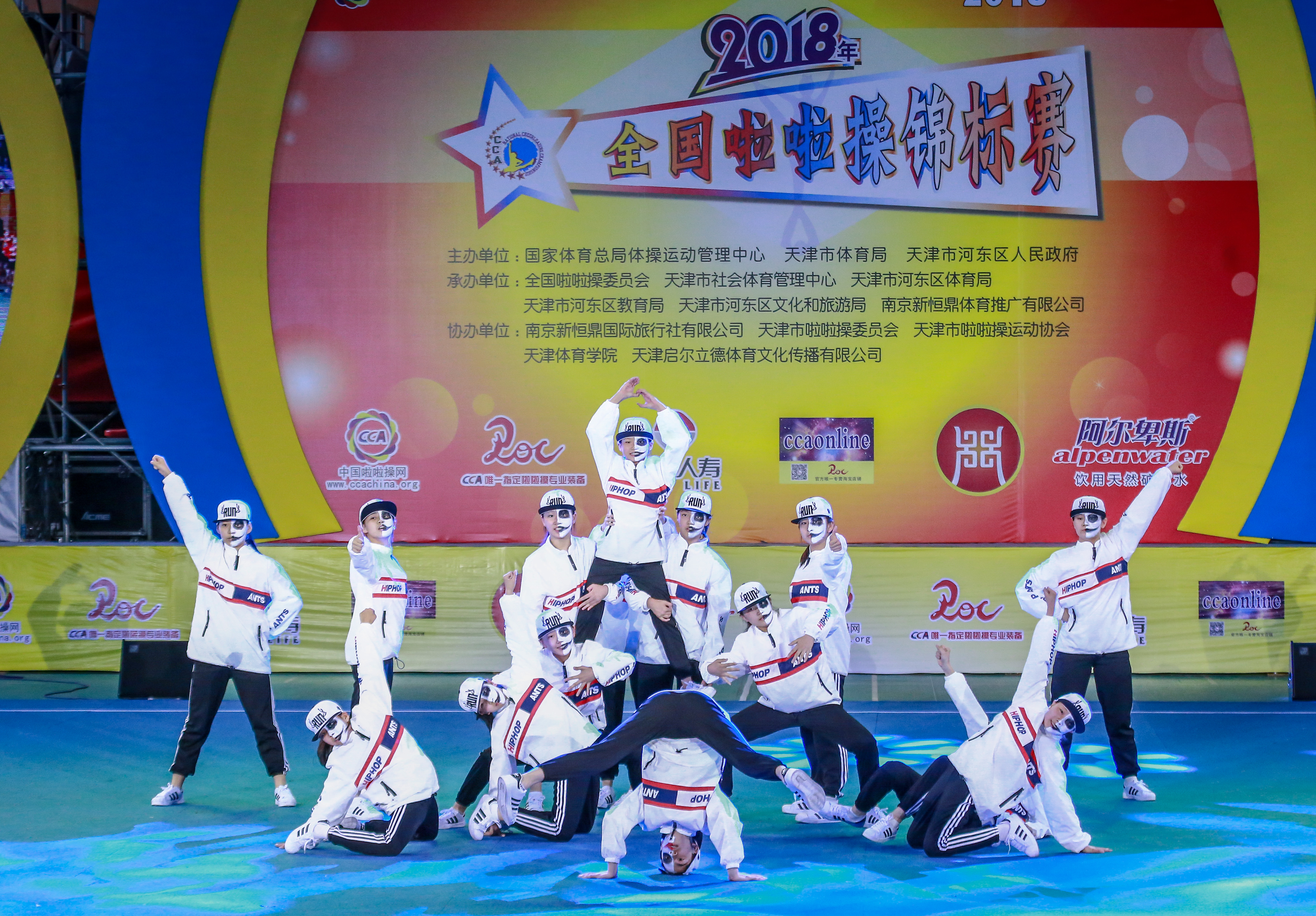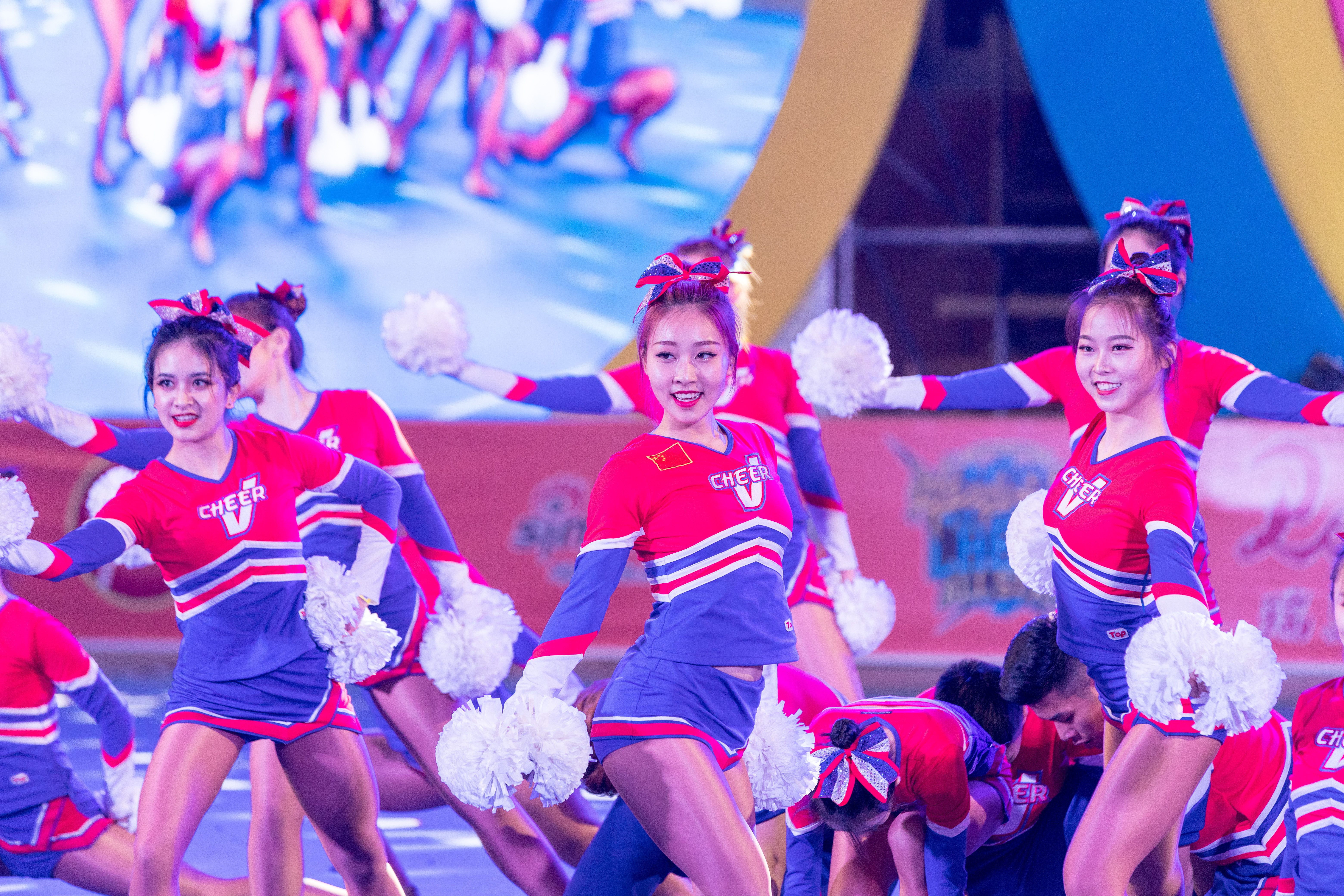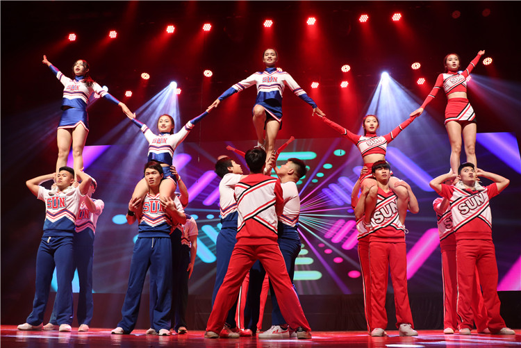 (1)花球舞蹈啦啦操:融合爵士和街舞的理念,成套动作全程需要100%使用花球,结合啦啦操基本手位、个性舞蹈、难度动作、舞蹈技巧等动作元素,展现干净、精准的特征以及良好的花球运用技术。要求展示整齐一致、层次、队形不断变化等集体动作视觉效果。