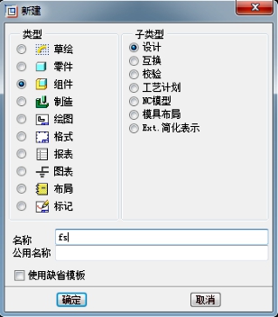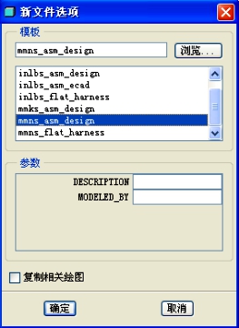 (一)选择【文件】—【新建】,在弹出的新建对话框中选中【组件】类型,子类型选择【设计】,修改组件名称后去除【使用缺省模板】前的勾,在出现的模板选择选项卡中选择mmns_asm_desing模板,单击【确定】进入组件环境。如图3-1-10、图3-1-11、图3-1-12所示。