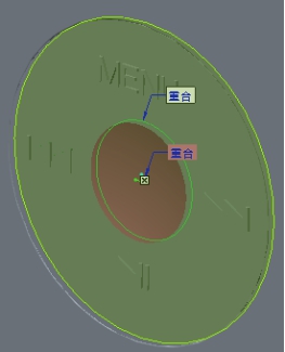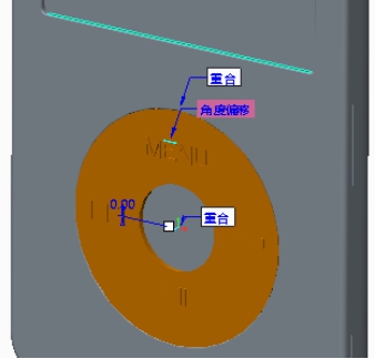 (组装工具),浏览找到环形按钮零件3-1-5.prt,确定后将其装入组件环境,将其调整至大致装配位置,如图3-1-24所示。点击装配工具栏的【放置】选项卡,对两个零件添加几何约束关系,分别选择环形按钮的中心轴与按钮槽的中心轴重合,环形按钮的后表面与按钮槽的底面重合,字样Menu的上表面与水平基准面角度为0,如图3-1-25所示,点