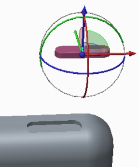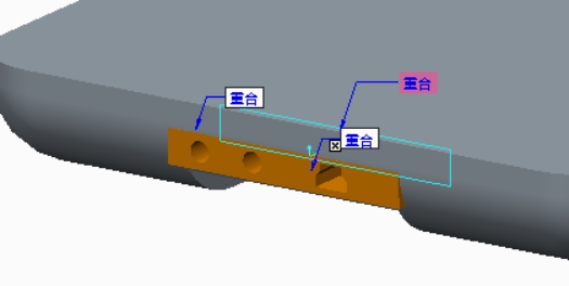 (组装工具),浏览找到开关零件3-1-6.prt,确定后将其装入组件环境,将其调整至大致装配位置,如图3-1-20所示。点击装配工具栏的【放置】选项卡,对两个零件添加几何约束关系,分别选择开关左侧圆弧面与开关槽左侧圆弧面重合,开关右侧圆弧面与开关槽右侧圆弧面定向,开关下表面与开关槽底面重合,如图3-1-21所示,点
