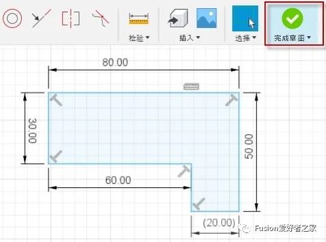 Fusion 360提供完成草图命令。绘制或编辑草图后,使用此命令正式结束草图并开始三维建模命令。