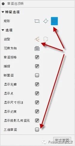 Fusion 360中的草图托盘是老式的预设功能区和新式的上下文关联功能区用户界面的混合。AutoCAD也广泛地使用托盘。但是Fusion 360中的这个草图托盘具有高度的上下文关联,并根据激活的命令或在图形区域中选择的对象不断调整可用的选项。问题是这些东西中的大多数很容易被忽略,除非你提前知道这些功能并根据自己的需要很好的利用了它们。 特征选项部分将允许您在矩形、圆弧、圆、槽和多边形类型之间切换,而无需从功能区子菜单系统中选择或通过S键搜索。