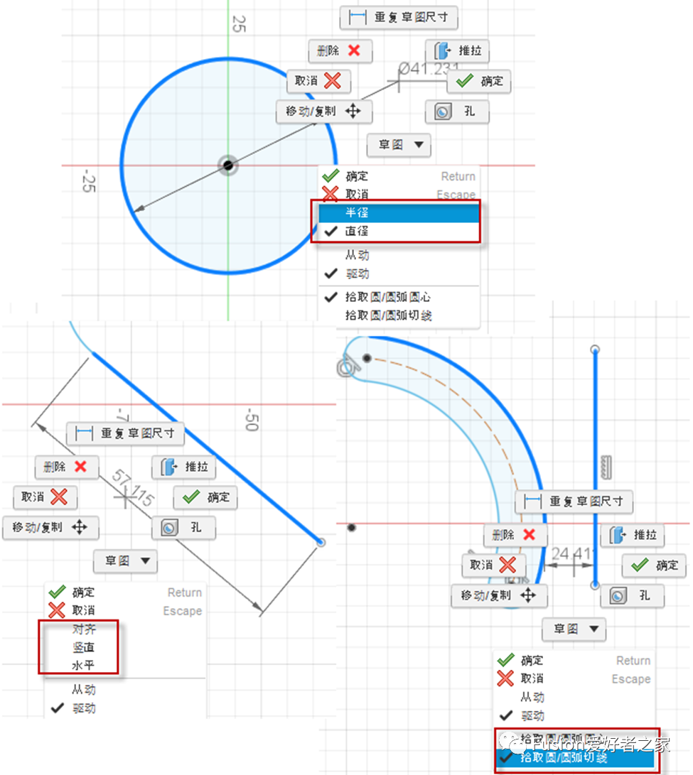 在草图中标注尺寸时,可以通过关联菜单更改尺寸的格式。确保“标注”命令处于激活状态,然后单击鼠标右键。使用“半径/直径”切换,您需要已经选择圆弧/圆才能查看选项。以一定角度标注直线尺寸时也是如此。在选择中心标注或切线标注时,可以在第一次选择之前或第二次选择之前进行设置。